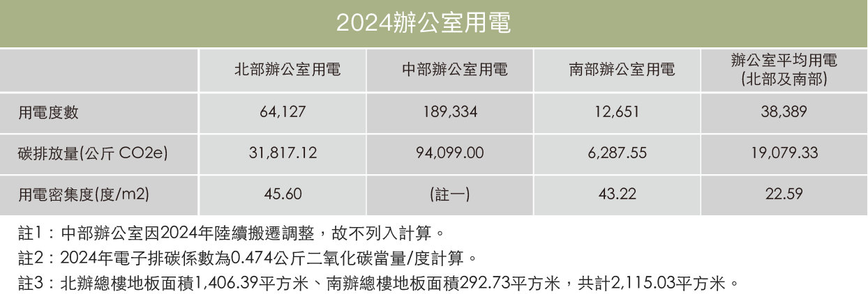 2024年統計辦公室用電,平均用電密集度為22.59度/平方公尺