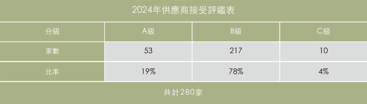瑞助營造於2024年度接受評鑑之工地共有數案,評鑑標準以『供應商/承攬商環境及社會責任之實行準則』作為依據,2024年接受評鑑的供應商/承攬商共計280家,各級評等供應商/承攬商家數及所佔比率如下: